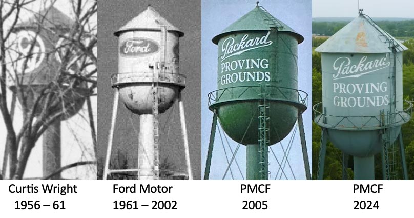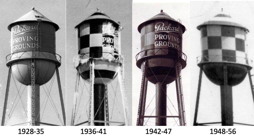 The water tower was never a solid color while Packard owned the property from 1928 to 1956. Aircraft engine testing began in 1928 but ceased in 1930. The checkerboard pattern appeared in about 1936. The proving grounds was later designated as an emergency landing field. The pictures above show the four schemes that have been verified. The dates are approximate.