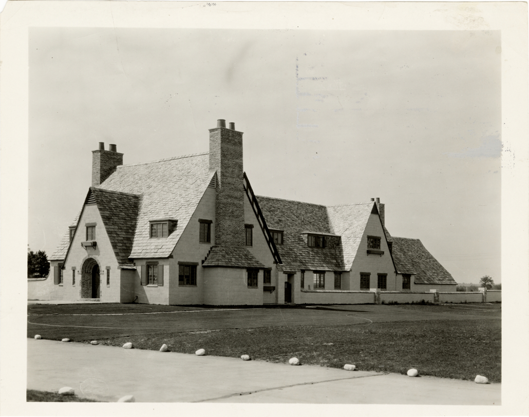 For several years Packard entertained the idea of building a test facility some distance away from the factory in the farmland north of Detroit. In the late 1920s the board of directors approved the purchase of a 560-acre site in the Charter Township of Shelby, Michigan. Once again, Packard engaged the services of Albert Kahn to design this facility. It was to be a working engineering facility for testing Packard automobiles but it would need to have the visual appeal of a country estate. The architectural firm delivered on these goals magnificently. From the Tudor Revival lodge to the repair garage covered with pitched slate roofs and multiple gables, to the substantial rock and wrought iron entrance gates, Kahn’s firm achieved the appearance of a grand country estate, one that firmly appealed to the aspirations of the buyers of Packard luxury cars.