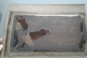 This is one of the items from the collection I’m currently processing. I must admit that I don’t know what it is, let alone what it was in its former life. In its present life, it’s some kind of facsimile placard sandwiched between a piece of cardboard and a sheet of thin plastic, both of which were glued together. I can barely read any of the descriptive information printed on it because it’s begun to rot inside its makeshift prison, which (even more sadly) makes this particular item basically useless as a contextual artifact.