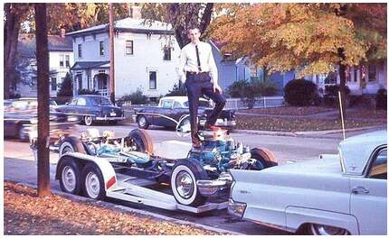 Curt Fischbach purchased the Display from the University of Michigan’s Automotive Engineering Laboratory in October 1963, where Packard’s former VP and Chief Engineer Bill Graves was Director of the Laboratory and had been his faculty advisor at the University of Michigan. Bill stated it was the only one of the six produced as a 1956 demo. The above photo shows Curt proudly having taken procession in October 1963, with the chassis on a trailer hooked to his 1960 Lincoln Continental Mark V. Curt later traded the unit to antique car collector Homer Fitterling of South Bend, Indiana, in 1969.
